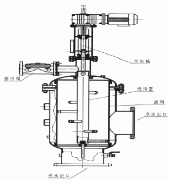 過濾過程:污水從過濾器進口進入,然后從里向外通過濾網,比網孔大的雜質被攔截下來并積累在濾網的內表面形成濾餅,這些濾餅同時能夠捕捉水中的一些更細小的雜質。自清洗過程:壓差開關持續地檢測濾網內外的壓差,當達到預設值時將傳遞信號到控制箱啟動清洗循環。過濾器的清洗機構是作螺旋式上下運動的吸污器,它是空心結構,在它的軸線上按一定距離垂直均勻分布著若干個吸污管。吸污器與一個排污閥相通。在排污閥打開時,過濾器內部水壓與外部大氣之間形成的壓差使吸污管產生強勁吸力,水流從濾網外向內反向高速流動將雜質沖下來進入吸污器通過排污閥排出。吸污器由一個連有絲桿裝置的雙向電機驅動,按照固定的轉速作螺旋式的運動,這樣多個吸嘴就能吸遍整個濾網內表面,這個過程大約需要半分鐘。在整個反清洗過程中,系統不斷流。過濾器的整個運行由程序控制器(PLC)來控制完成。圖1 為北京化工大學與唐山陸凱科技有限公司共同研制的吸污式自清洗過濾器結構示意圖。